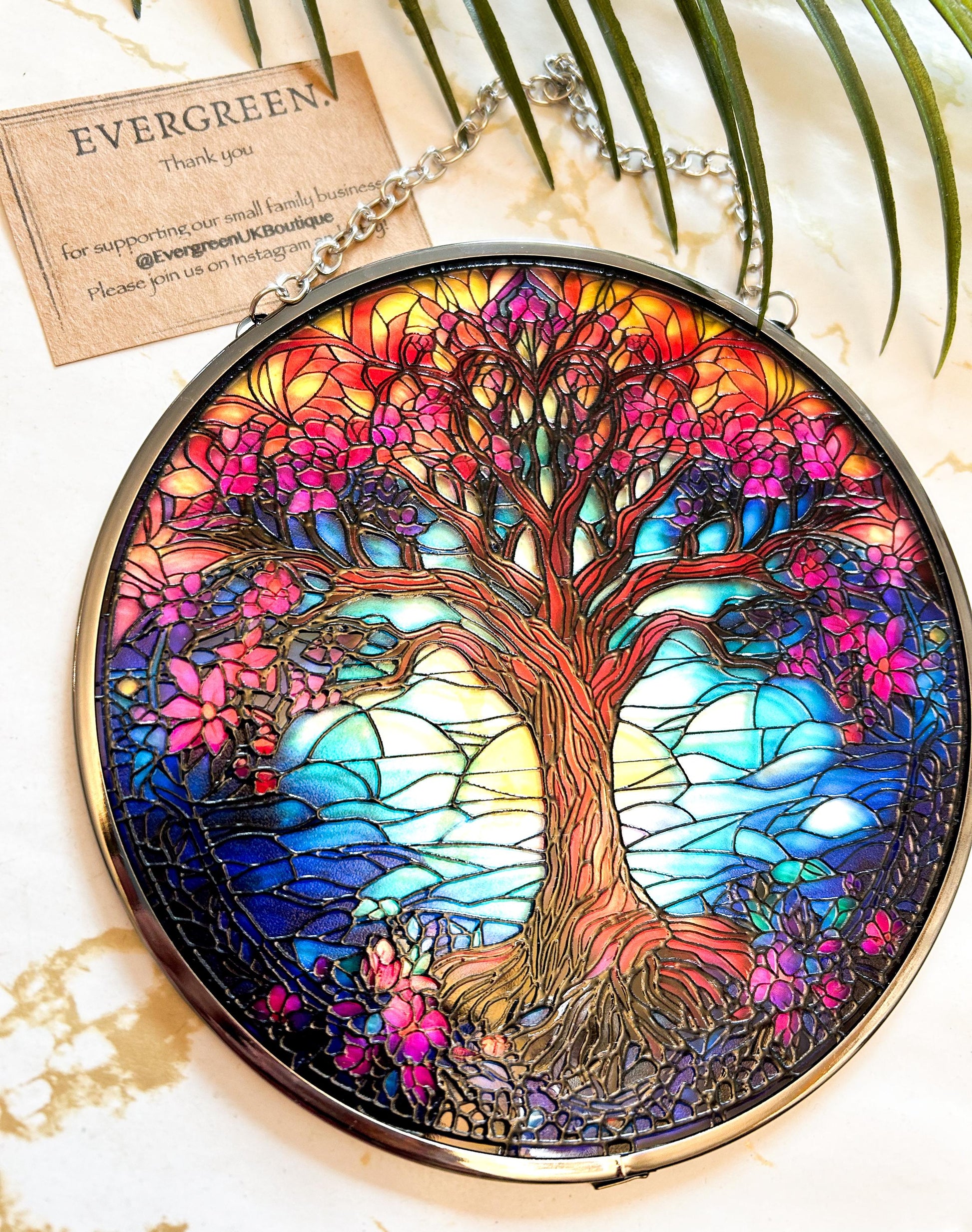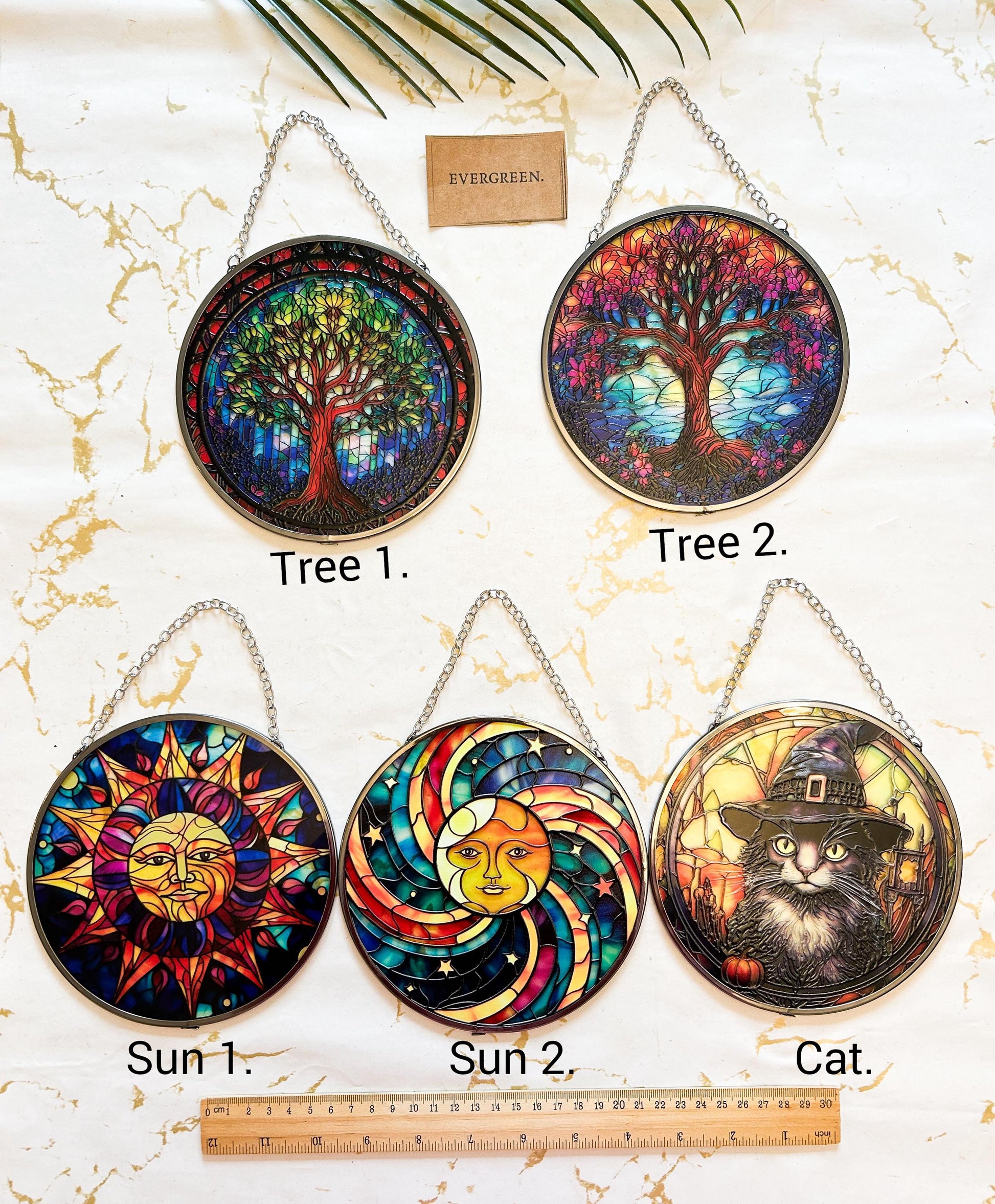 Circular Hanging Stained Glass Sun Catcher - Tree / Sun / Cat