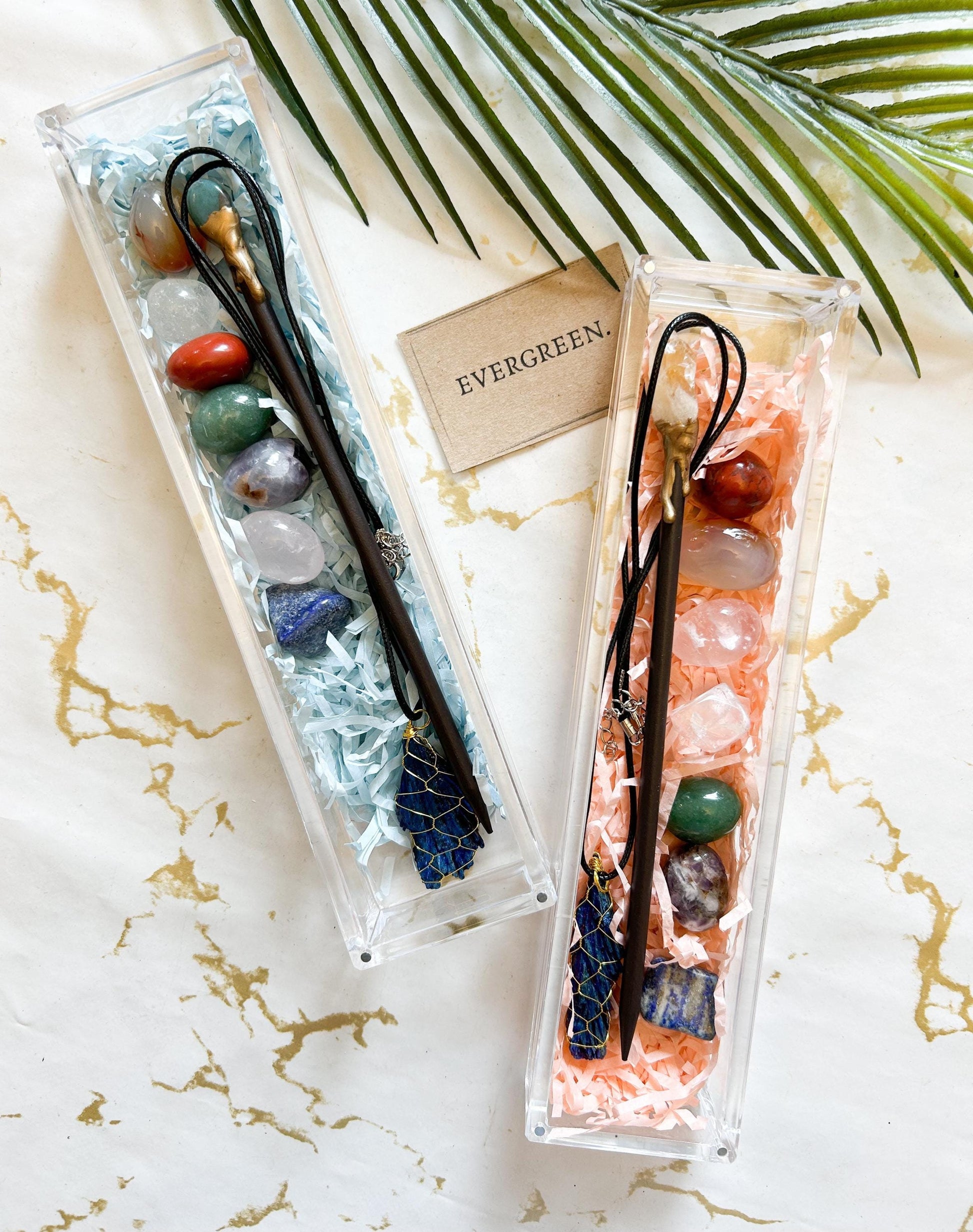 Crystal Gift Set - Tourmaline Aura Crystal Feather Necklace, Crystal Pencil, 7 Chakra Tumbled Stones