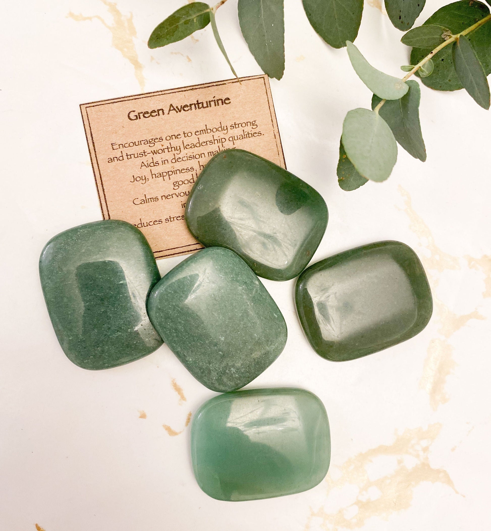 Green Aventurine encourages one to embody strong and trust-worthy leadership qualities. Aids in decision making. Joy, happiness, harmony and good luck. Calms nervousness, anger and irritation. Reduces stress and enhances sleep.