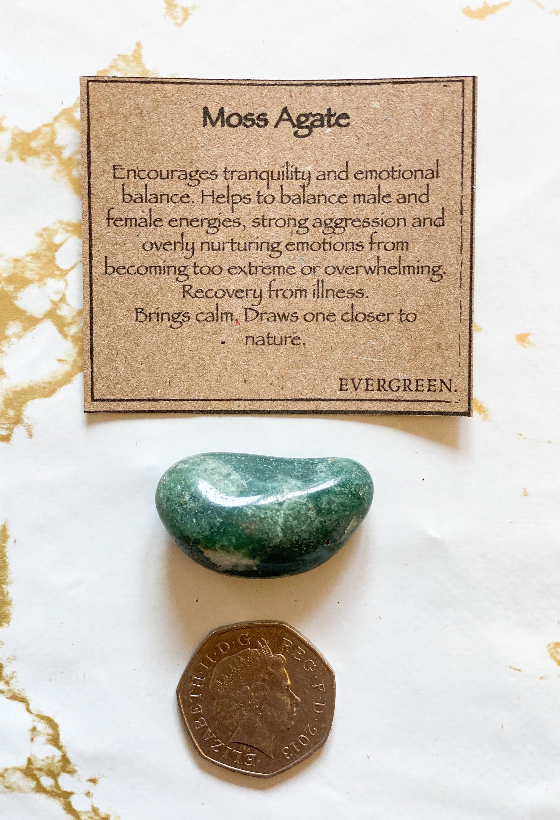 Moss Agate encourages tranquility and emotional balance. Helps to balance male and female energies, strong aggression and overly nurturing emotions from