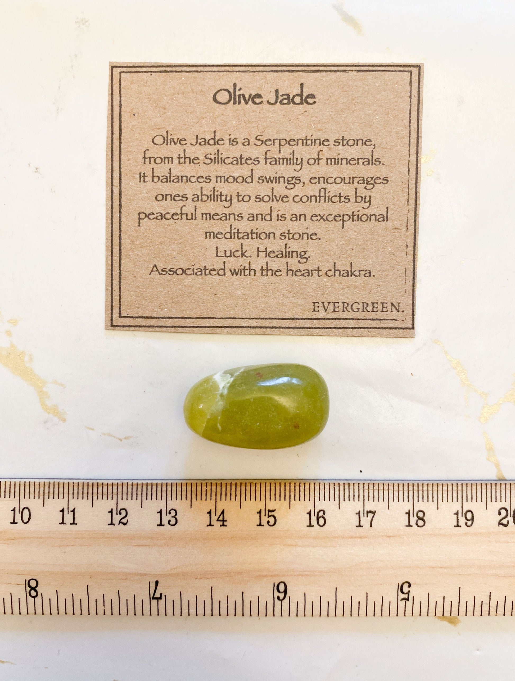 Olive Jade is a Serpentine stone, from the Silicates family of minerals. It balances mood swings, encourages ones ability to solve conflicts by peaceful means and is an exceptional meditation stone. Luck. Healing. Associated with the heart chakra.