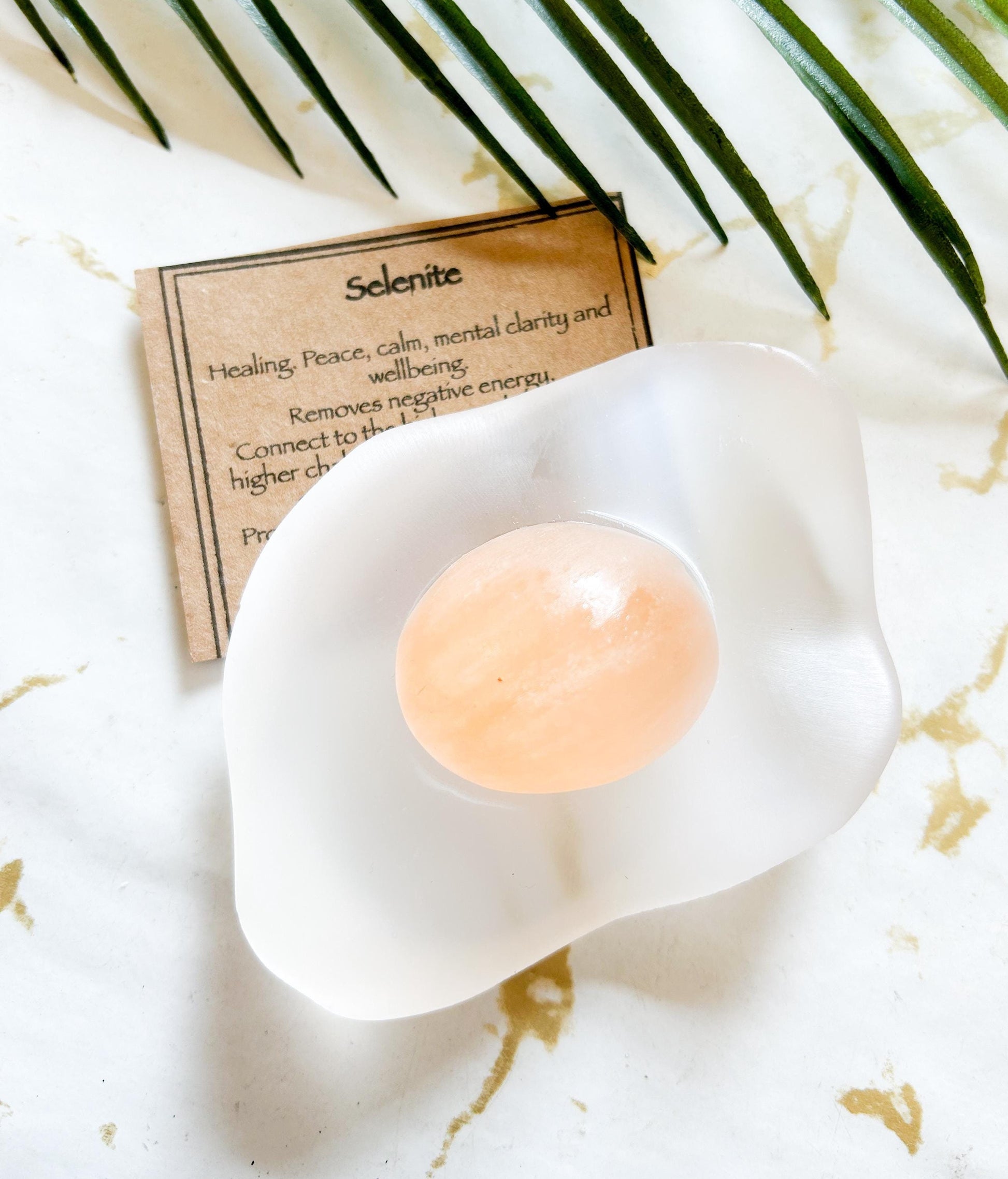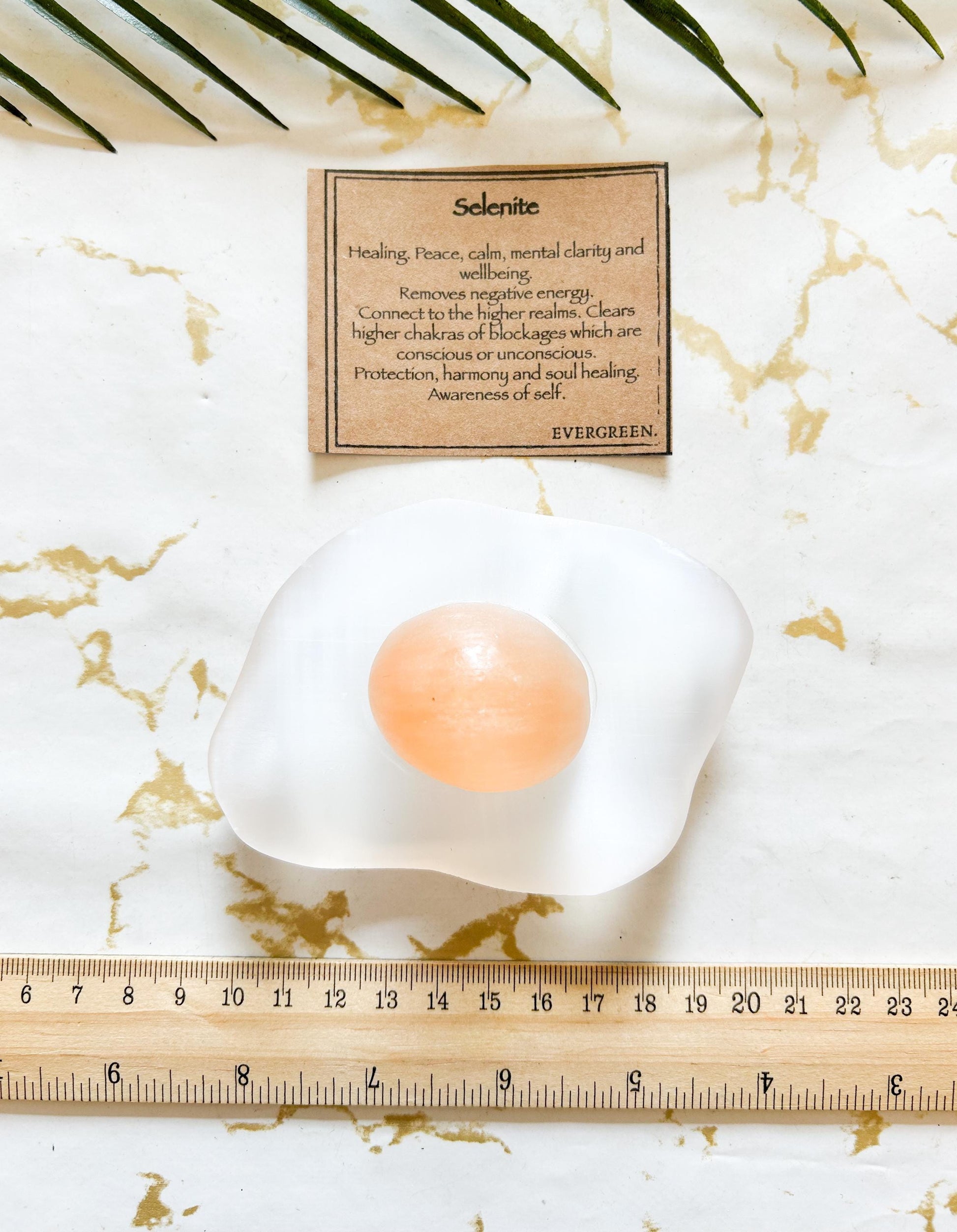 Selenite Crystal Fried Egg Carving - Peace, Clarity & Wellbeing